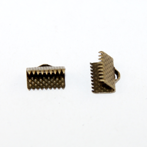 Ribbon crimps or choker clasps are used when working with woven fabrics or leather. They can also be used with handsewn pieces. This crimp is 10mm wide and is made from Zinc Alloy and has been plated in Antique Bronze.