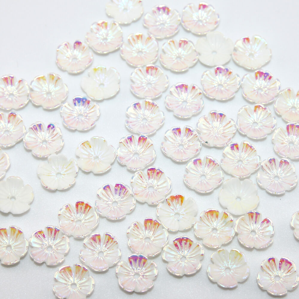 Bring floral beauty and texture to your bead embroidery projects with these Acrylic Flower Beads. Each flower features a flat bottom, making it easy to stitch securely onto fabric or bead foundations — perfect for seed bead embroidery, brooches, or decorative accents on accessories. Lightweight yet sturdy, these acrylic blooms add dimension without weighing your work down. Their finely detailed petals capture light beautifully, giving your designs a soft, radiant sparkle. Use them as focal points in floral motifs, or combine them with seed beads, crystals, and pearls for a lush, layered effect. The flat base also makes them ideal for gluing onto settings or bezels, offering versatile design possibilities. Available in a variety of colours, these flower beads are a wonderful way to bring life, colour, and texture to your creative projects — from jewellery to decorative embellishments. 10mm White AB 5 Petals Acrylic Flower - 10 Piece Pack