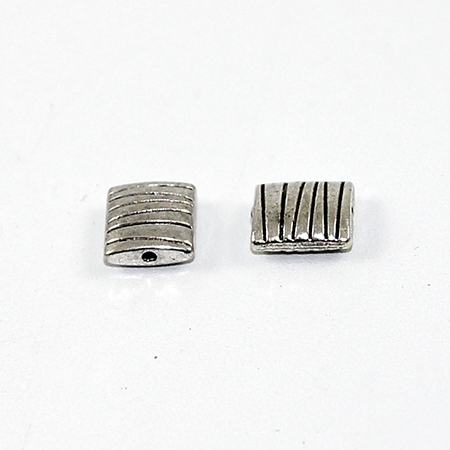 A antique silver finished rectangle spacer bead with etched black detailed stripes. Great to use in a necklace, bracelet or earrings with a few spacer beads, or as a spacer bead in one of your designs. Piece is 10mm x 9mm x 4mm with a 1mm hole.