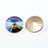 Style - Rivoli 1122 Size - 14mm Colour - Paradise Shine Rivoli stands for simplicity and elegance. The sharp lines of this cut form a geometric pattern with high-precision faceting that results in a subtle yet clear brilliance. Its elegant appeal make the Rivoli Round Stone a true classic that works both in simple and intricate design pieces. With its modern yet distinctive sparkle, the Rivoli Round lends a certain level of sophistication to every look. This stone is perfect to use in hand sewing / weaving designs, capturing in filagrees / wire wrapping, setting in crystal / metal / polymer clay. These stones are made from glass with a foil backing, we recommend that you seal the foil backing prior to use.
