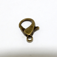 In StockA lobster clasp also known as a lobster hook, it is a fastener that is held closed by a spring. The lobster clasp is opened or closed by holding a small lever, usually with a fingernail, long enough to apply, then it is attached (or removed from) a short link-chain, end tag or a ring. Lobster clasps are often used for necklaces, bracelets, and keychains. Lobster clasps are named as such because of their "pinching" mechanism, and they are often shaped like a lobster's claw. This 16mm x 8mmlobster clasp is made from zinc alloy and has been plated in Antique Bronze.