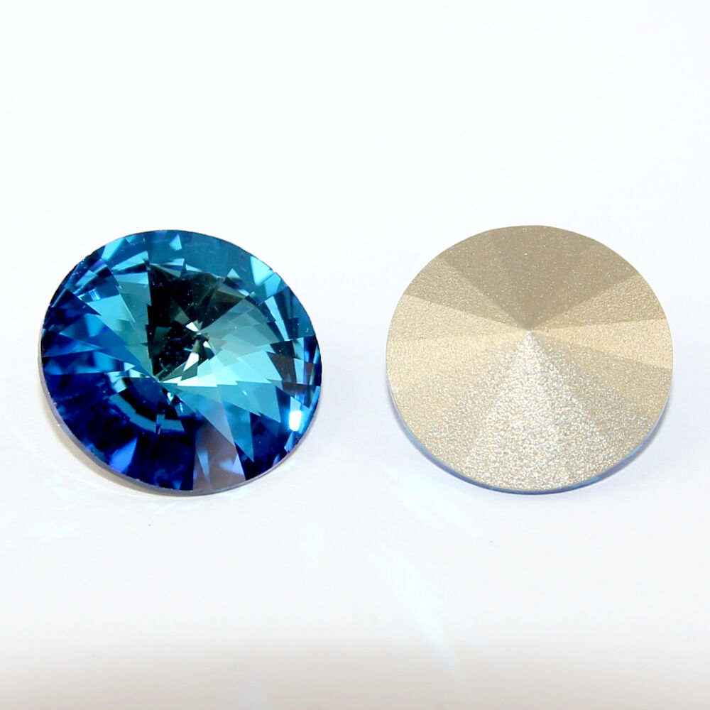 Style - Rivoli 1122 Size - 18mm Colour - Bermuda Blue Rivoli stands for simplicity and elegance. The sharp lines of this cut form a geometric pattern with high-precision faceting that results in a subtle yet clear brilliance. Its elegant appeal make the Rivoli Round Stone a true classic that works both in simple and intricate design pieces. With its modern yet distinctive sparkle, the Rivoli Round lends a certain level of sophistication to every look. This stone is perfect to use in hand sewing / weaving designs, capturing in filagrees / wire wrapping, setting in crystal / metal / polymer clay. These stones are made from glass with a foil backing, we recommend that you seal the foil backing prior to use.