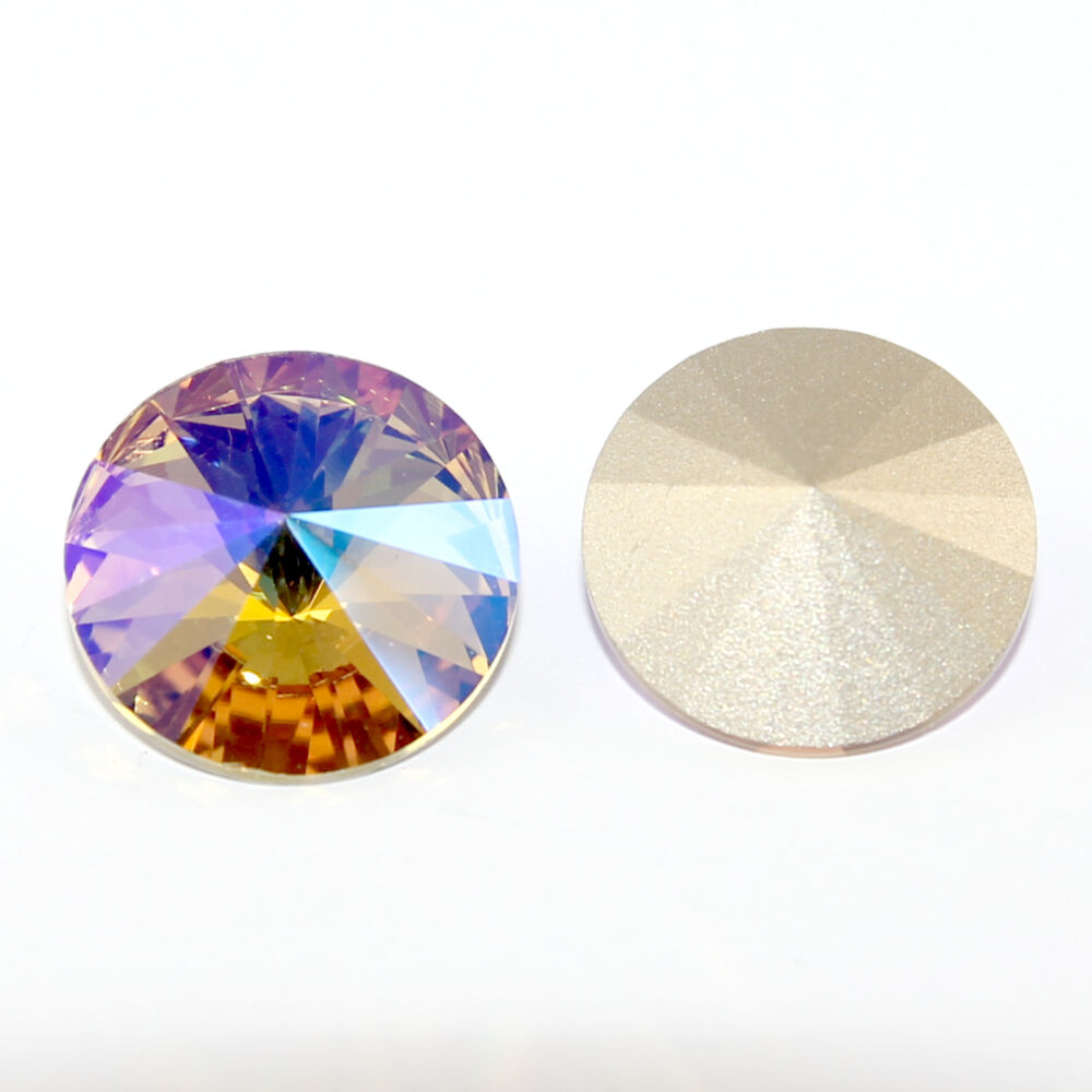 Style - Rivoli 1122 Size - 18mm Colour - Paradise Shine Rivoli stands for simplicity and elegance. The sharp lines of this cut form a geometric pattern with high-precision faceting that results in a subtle yet clear brilliance. Its elegant appeal make the Rivoli Round Stone a true classic that works both in simple and intricate design pieces. With its modern yet distinctive sparkle, the Rivoli Round lends a certain level of sophistication to every look. This stone is perfect to use in hand sewing / weaving designs, capturing in filagrees / wire wrapping, setting in crystal / metal / polymer clay. These stones are made from glass with a foil backing, we recommend that you seal the foil backing prior to use.