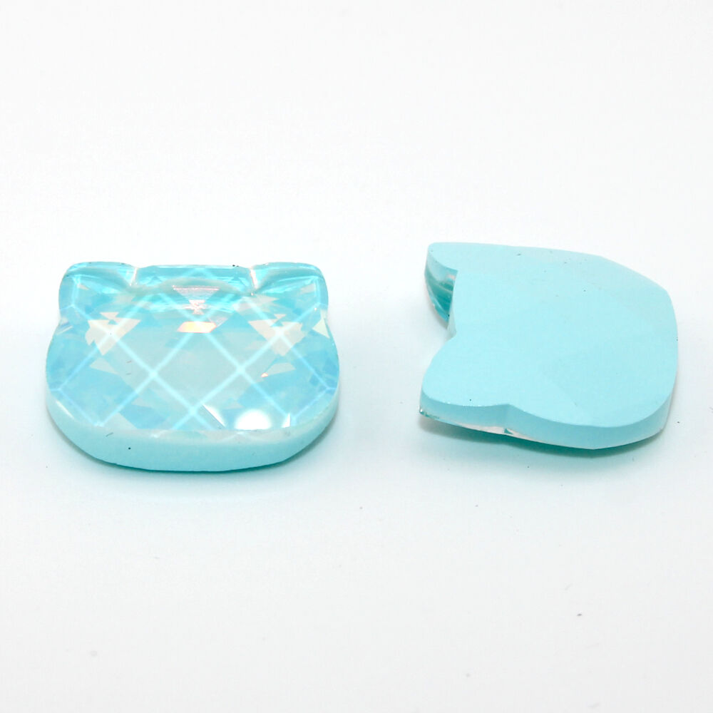 20mm x 23mm Cat Face Faceted Stone - Aquamarine Opal AB Lacquer Bring personality and sparkle to your designs with this charming faceted glass cat face stone. Measuring 20mm x 30mm, this beautifully crafted piece features a sculpted feline face with intricate details and light-catching facets that shimmer with every movement. Perfect as a statement focal in pendants, brooches, or beaded designs, it adds a whimsical yet elegant touch to your creations. The smooth, polished finish and precise shaping make it ideal for creative jewellery, costume, or decorative projects. A delightful piece for cat lovers and designers alike, ready to add character and brilliance to any handmade work.
