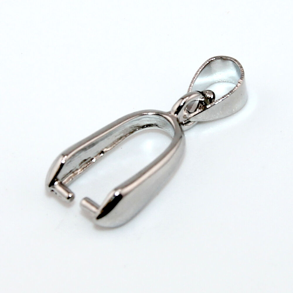 Pinch bails are used for top-drilled beads to create a dangle for necklace or earrings. They are easy to use and functional for jewelry-making. Pinch bails have two prongs at the bottom which will insert into the hole of your top drilled bead. Gently pinch the bail to close. The Pinch Bail hanger has a bail on top of the hanger which enables you to hang it from a chain or cord necklace easily. This Pinch Bail with Hanger is 24mm x 11mm and is made from Copper with a Platinum plate finish. 24mm x 11mm Pinch Bail with Hanger - Platinum