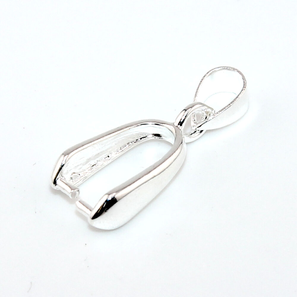 Pinch bails are used for top-drilled beads to create a dangle for necklace or earrings. They are easy to use and functional for jewelry-making. Pinch bails have two prongs at the bottom which will insert into the hole of your top drilled bead. Gently pinch the bail to close. The Pinch Bail hanger has a bail on top of the hanger which enables you to hang it from a chain or cord necklace easily. This Pinch Bail with Hanger is 24mm x 11mm and is made from Copper with a Silver plate finish. 24mm x 11mm Pinch Bail with Hanger - Silver