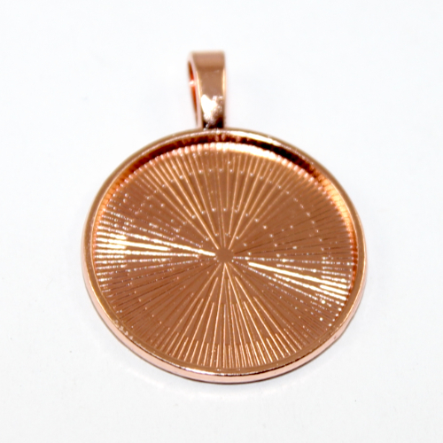 A round pendant setting with a bail designed to work with 25mm cabochons. You can use your own print or photo with a clear cabochon dome, use a resin or glass cabochon on range. For those feeling inspired this settings is suitable for use with crystal clay. These pendants are made from Zinc Alloy and plated in Rose Gold.