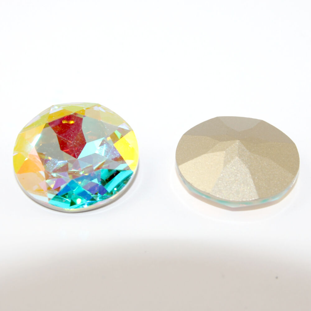 Style - Flat Chaton 1201 Size - 27mm Colour - Crystal AB The outstanding precision of the Flat Chaton comes from its intricate cut, which features multiple facets. Thanks to its superior cut and classic appeal, it fits perfectly into compact and high-grade designs—for example, in the jewelry segment. This stone is perfect to use in hand sewing / weaving designs, capturing in filagrees / wire wrapping, setting in crystal / metal / polymer clay. These stones are made from glass with a foil backing, we recommend that you seal the foil backing prior to use.