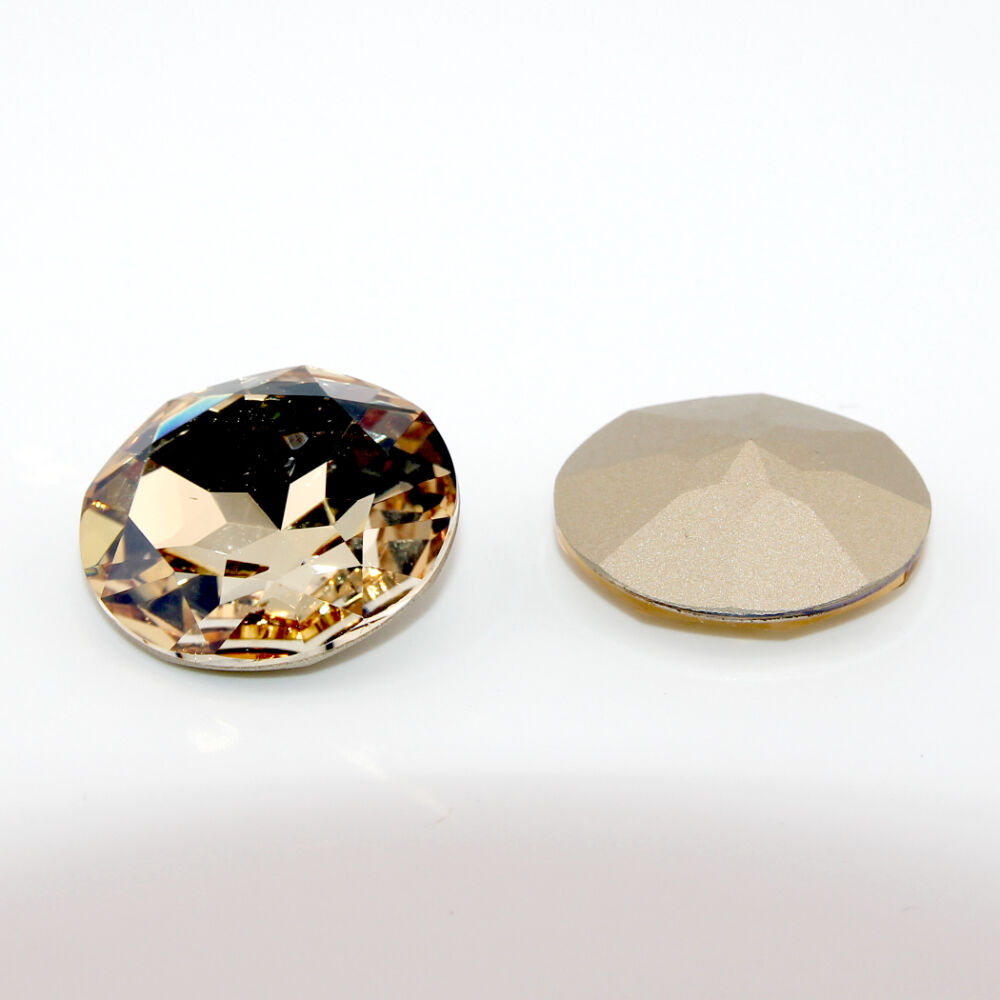 Style - Flat Chaton 1201 Size - 27mm Colour - Golden Shadow The outstanding precision of the Flat Chaton comes from its intricate cut, which features multiple facets. Thanks to its superior cut and classic appeal, it fits perfectly into compact and high-grade designs—for example, in the jewelry segment. This stone is perfect to use in hand sewing / weaving designs, capturing in filagrees / wire wrapping, setting in crystal / metal / polymer clay. These stones are made from glass with a foil backing, we recommend that you seal the foil backing prior to use.