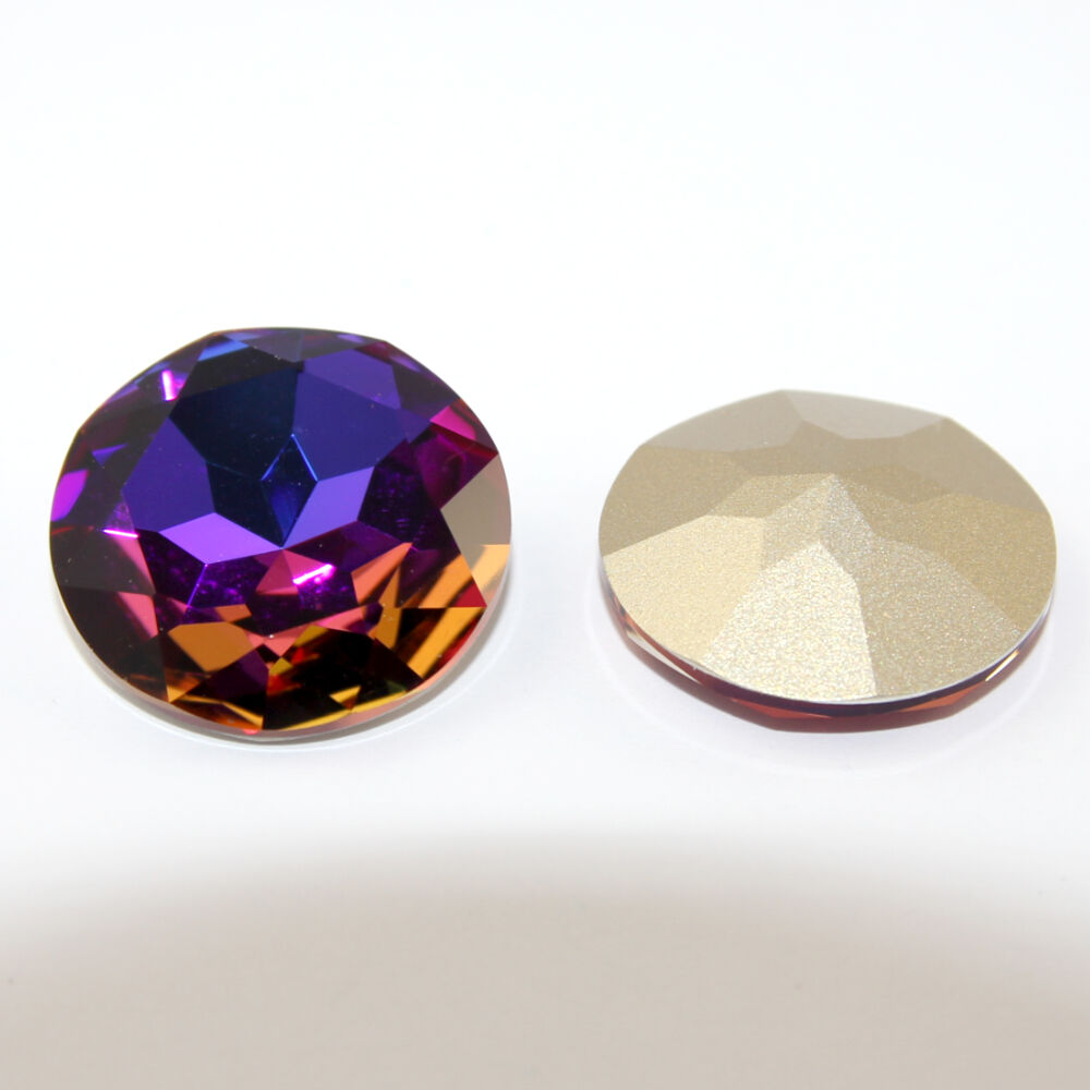 Style - Flat Chaton 1201 Size - 27mm Colour - Volcano Shimmer The outstanding precision of the Flat Chaton comes from its intricate cut, which features multiple facets. Thanks to its superior cut and classic appeal, it fits perfectly into compact and high-grade designs—for example, in the jewelry segment. This stone is perfect to use in hand sewing / weaving designs, capturing in filagrees / wire wrapping, setting in crystal / metal / polymer clay. These stones are made from glass with a foil backing, we recommend that you seal the foil backing prior to use.