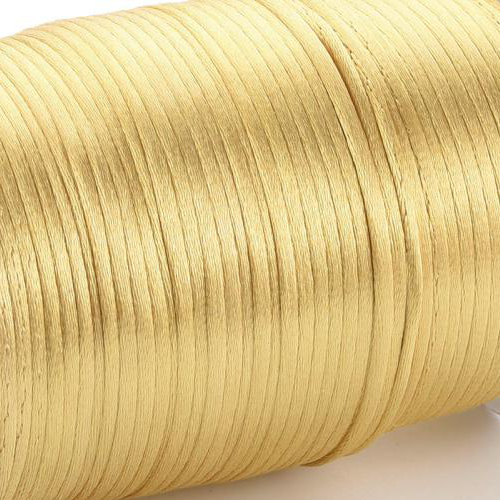 This 2mm Bright Gold satin cord is made from 100% polyester, like all satin cord it is a shimmery cord which reflect lights, soft and slippery to touch it is a woven cord with a center core. Suitable for use in cords for necklace or for stringing beads with large holes and for Chinese ornamental knotting.