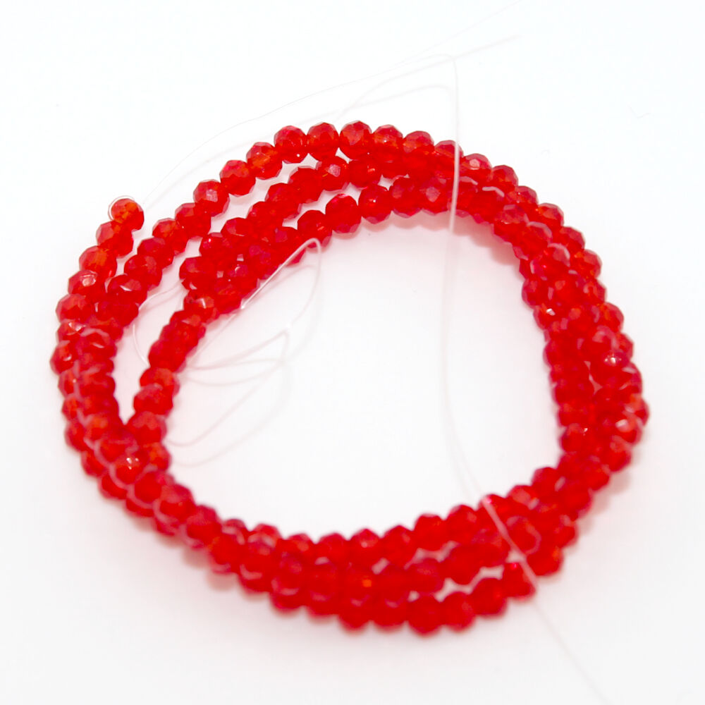 Rondelles are a versatile bead which can be used as a spacer in between larger beads or on their own to make an impact. These transparent Red glass rondelles are 2mm x 3mm with a 0.8mm hole.