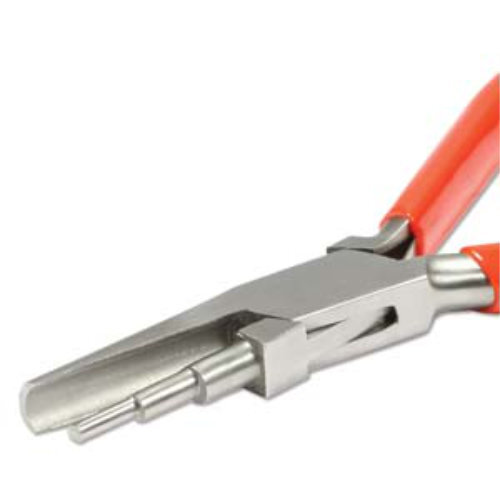 3-Step Round/Hollow Plier - Double Spring - PL34 Item Code: PL34 Half hollow, half round 3-stepped pliers. Hollowed out jaws help hold rings, jump rings and large bails. The 3 steps measure: 2.3mm, 3.7mm, and 4.8mm. Double spring and red handle.