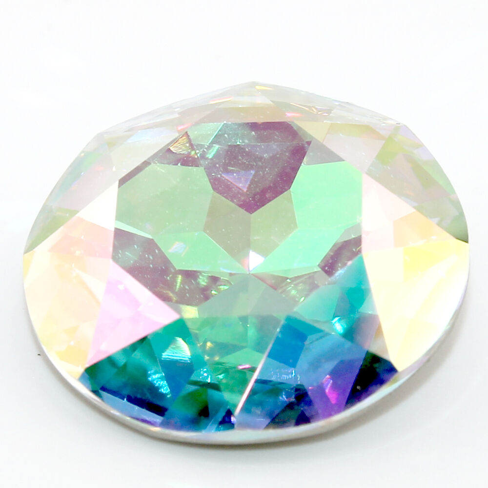 Style - Flat Chaton 1201 Size - 35mm Colour - Luminous Green The outstanding precision of the Flat Chaton comes from its intricate cut, which features multiple facets. Thanks to its superior cut and classic appeal, it fits perfectly into compact and high-grade designs—for example, in the jewelry segment. This stone is perfect to use in hand sewing / weaving designs, capturing in filagrees / wire wrapping, setting in crystal / metal / polymer clay. These stones are made from glass with a foil backing, we recommend that you seal the foil backing prior to use.