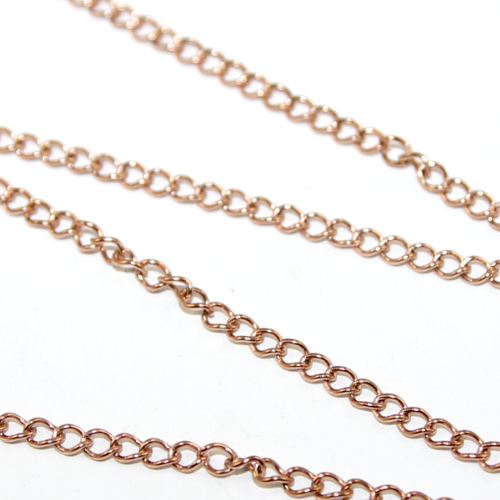 A simple round curb chain, suitable for use to create a necklace to hang a pendant or to use to create a chain tassel. This unsoldered 304 Stainless Steel has 3mm wide links and has been plated in rose gold. This chain is sold in a 2m length.