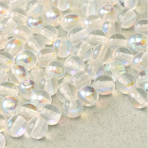 In StockSize: 3mm Hole: 0.8mm Colour: Crystal AB - 00030-28701 Czech pressed Druk / Round Beads are a classic versatile bead, the smaller beads are great in hand sewn pieces as well as filler beads in strung designs. With the variety of sizes available you are sure to find one that works with any project.
