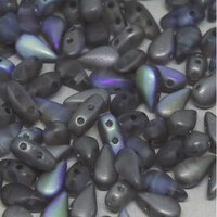 Size: 3mm x 6mm Hole: 1mm Colour: Crystal Graphite Rainbow Mate - 00030-98577 The Drop Duo is a rounded teardrop-shaped bead with a pointed top, they are 3mm x 6mm with 2 x 0.8mm holes. These beads are great to use to create heart & flower shapes or as a fringe bead in your bead weaving design. These beads are available in a bag of 30 or 600.