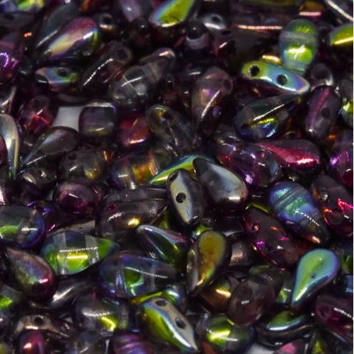 Size: 3mm x 6mm Hole: 1mm Colour: Crystal Magic Wine - 00030-95200 The Drop Duo is a rounded teardrop-shaped bead with a pointed top, they are 3mm x 6mm with 2 x 0.8mm holes. These beads are great to use to create heart & flower shapes or as a fringe bead in your bead weaving design. These beads are available in a bag of 30 or 600.