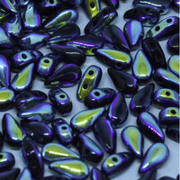 Size: 3mm x 6mm Hole: 1mm Colour: Jet AB Full - 23980-28703 The Drop Duo is a rounded teardrop-shaped bead with a pointed top, they are 3mm x 6mm with 2 x 0.8mm holes. These beads are great to use to create heart & flower shapes or as a fringe bead in your bead weaving design. These beads are available in a bag of 30 or 600.