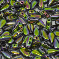 Size: 3mm x 6mm Hole: 1mm Colour: Jet Vitrail Full - 23980-28100 The Drop Duo is a rounded teardrop-shaped bead with a pointed top, they are 3mm x 6mm with 2 x 0.8mm holes. These beads are great to use to create heart & flower shapes or as a fringe bead in your bead weaving design. These beads are available in a bag of 30 or 600.