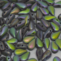 Size: 3mm x 6mm Hole: 1mm Colour: Jet Vitrail Full Matte - 23980-28170 The Drop Duo is a rounded teardrop-shaped bead with a pointed top, they are 3mm x 6mm with 2 x 0.8mm holes. These beads are great to use to create heart & flower shapes or as a fringe bead in your bead weaving design. These beads are available in a bag of 30 or 600.