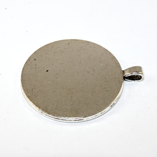 A round pendant setting with a bail designed to work with 40mm cabochons. You can use your own print or photo with a clear cabochon dome, use a resin or glass cabochon on range. For those feeling inspired this settings is suitable for use with crystal clay. These pendants are made from Zinc Alloy and plated in Platinum.