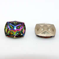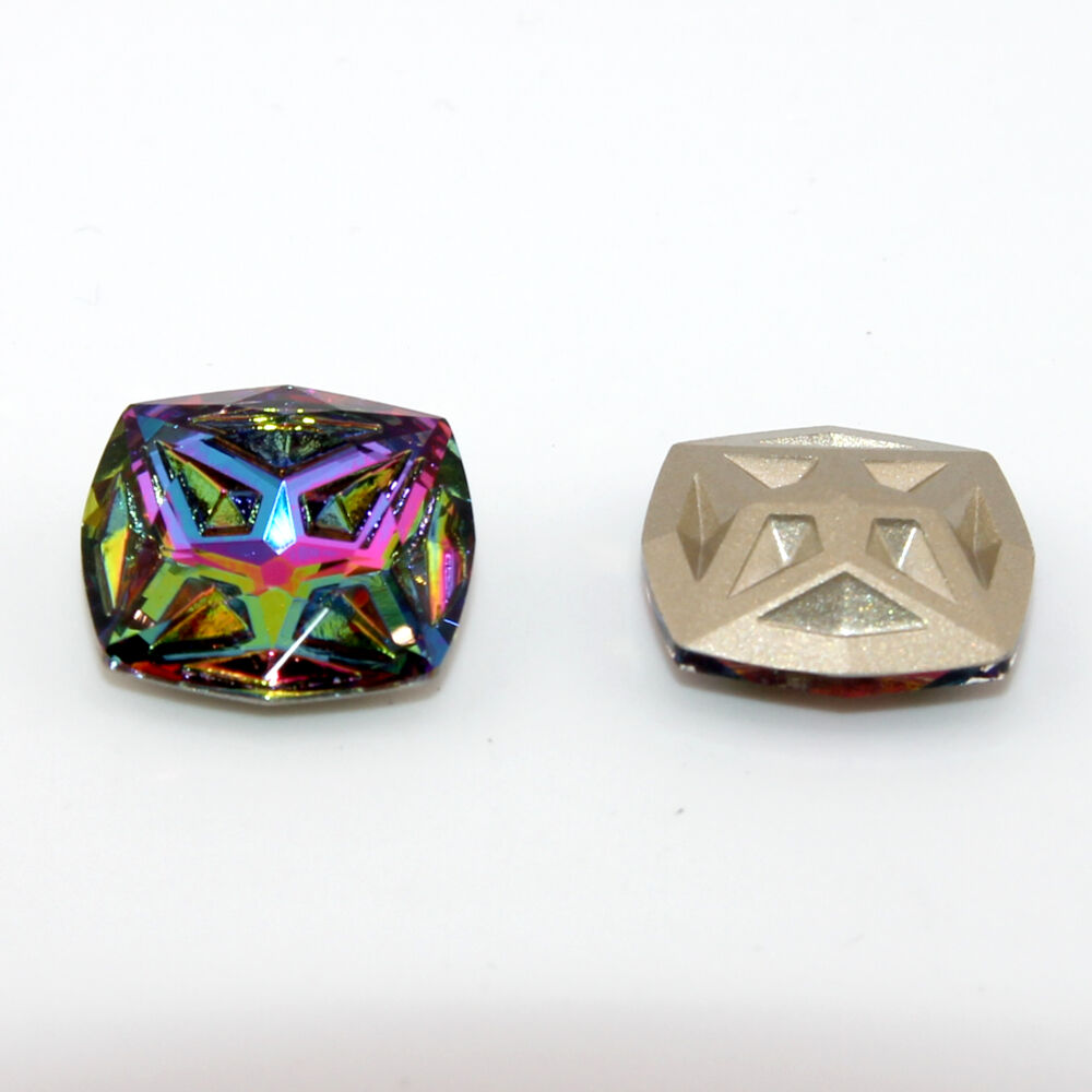 Size : 18mm Colour : Volcano The Cushion Square Stone has gemstone-like features, it is a classic design with asymmetrical faceting while remaining bold and dynamic through its many facets and cuts. This stone is perfect to use in hand sewing / weaving designs, capturing in filagrees / wire wrapping, setting in crystal / metal / polymer clay. These stones are made from glass with a foil backing, we recommend that you seal the foil backing prior to use.