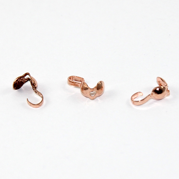 Calottes feature a threading hole are designed to provide a connection for stringing materials, once you have crimped or knotted your stringing material, simply curl the loop, fold the calotte in half and thread a jump ring through the loop to connect clasps or end tags. The calotte is made from iron alloy, measures 8mm x 4mm and has a rose gold plated finish.