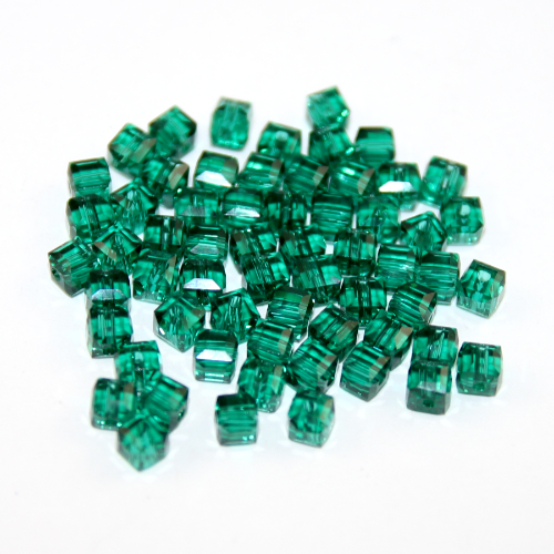 4mm Emerald Crystal Cube - 50 Piece Bag A classic, straight geometric shape merges with an intricate cut in this bead to produce a component that is perfect for masculine looks and designs with corners, but also work very well when combined with more playful products. This traditional and versatile bead is a must-have in every collection, offering a broad range of design possibilities for a variety of products, including jewelry sets, accessory embellishments, and DIY designs.