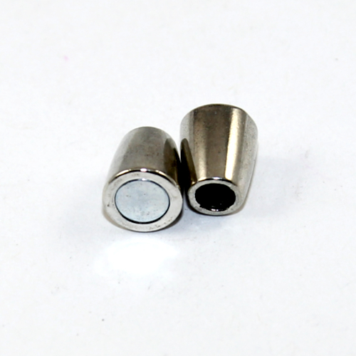 A glue in magnetic clasp in a cuved barrel shape. This magnet has a 4mm hole and is made from a zinc alloy. 4mm Platinum Glue in Barrel Magnetic Clasp