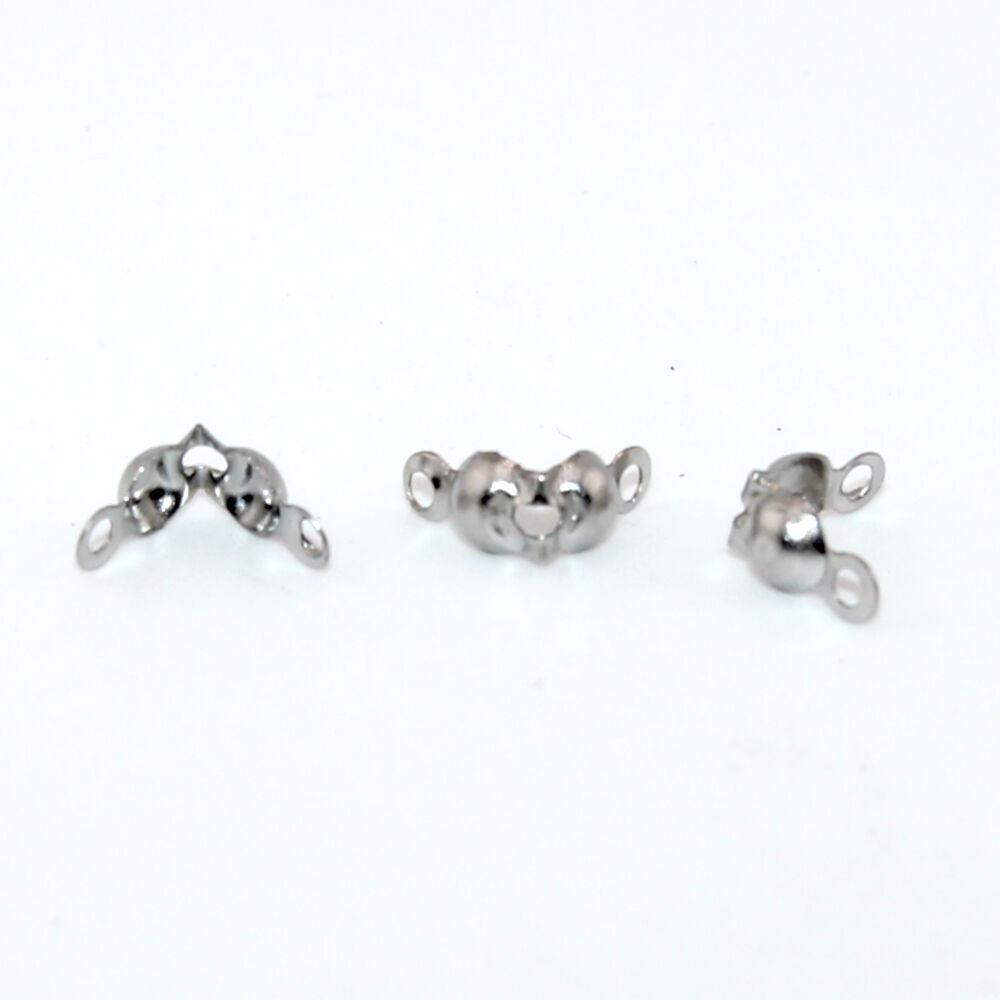 Calottes feature a threading hole are designed to provide a connection for stringing materials, once you have crimped or knotted your strining material, simply fold the calotted in half and thread a jump ring through the two holes to connect clasps or end tags. The calotte is made from 304 Stainless Steel measures 4mm x 8mm.