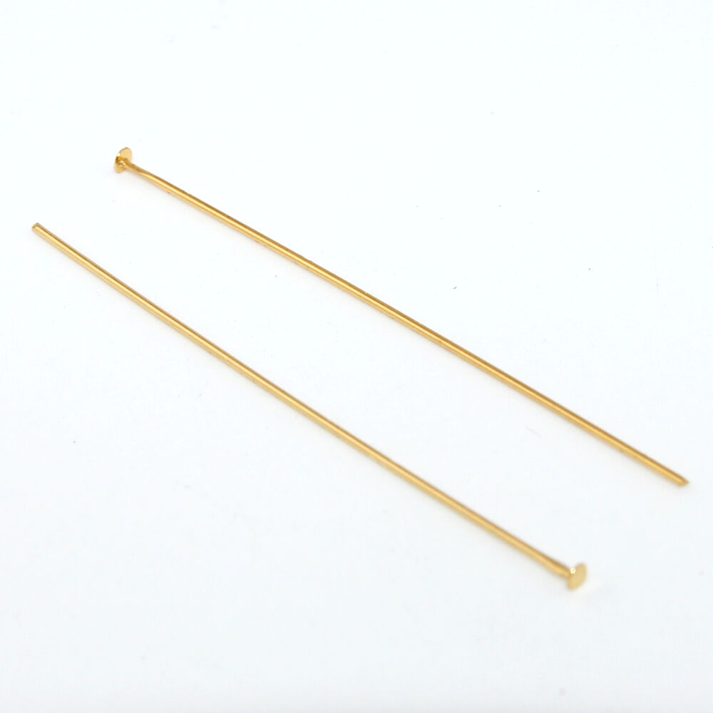 Headpins are indispensable components in jewelry making. These small, metal wires feature a flattened end, resembling a pinhead, that prevents beads and embellishments from slipping off. They act as anchors, allowing artisans to create secure and beautifully adorned designs. Headpins come in various lengths, gauges, and materials, such as stainless steel, sterling silver, and gold. By threading beads onto a headpin and forming a loop at the other end, jewelry makers can easily connect elements, fashioning elegant earrings, pendants, and dangles. These unassuming yet essential pieces facilitate the realization of intricate, personalized jewelry pieces, showcasing the marriage of functionality and aesthetics. 50mm x 0.6mm Brass Head Pin - Bright Gold Plated