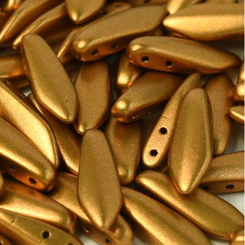 Size: 5mm x 16mm Hole: 0.8mm Colour: Brass Gold - 01740 Size: 5mm x 16mm x 3.5mm - the hole is less than 1mm in diameter. Get straight to the point of popular bead-weaving and stringing designs with these versatile, Czech pressed glass daggers. Used as dangles, drops, and flower petals when grouped together, these sleek beads add intriguing options to your designs. These Czech pressed glass beads have a uniform dagger shape and their large hole size to bead size ratio makes them ideal for consistent bead weaving texture and multiple passes of fine beading thread and are side drilled from the top.