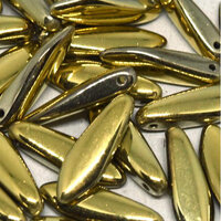 Get straight to the point of popular bead-weaving and stringing designs with these versatile, Czech pressed glass daggers. Used as dangles, drops and flower petals when grouped together, these sleek beads add intriguing options to your designs. These dagger shaped beads are side-drilled at the top.