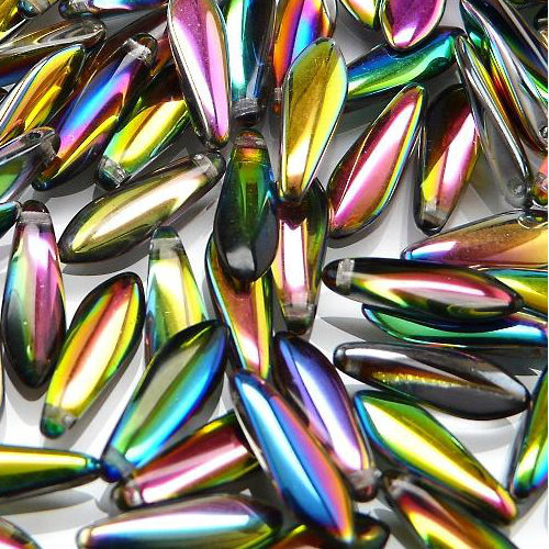Size: 5mm x 16mm Hole: 0.8mm Colour: Crystal Vitrail - 00030-28101 Get straight to the point of popular bead-weaving and stringing designs with these versatile, Czech pressed glass daggers. Used as dangles, drops and flower petals when grouped together, these sleek beads add intriguing options to your designs. These dagger shaped beads are side-drilled at the top.