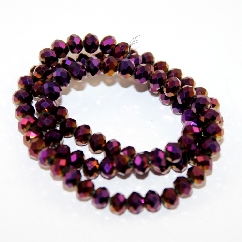 Rondelles are a versatile bead which can be used as a spacer in between larger beads or on their own to make an impact. These transparent Metallic Purple glass rondelles are 5mm x 6mm with a 1mm hole.