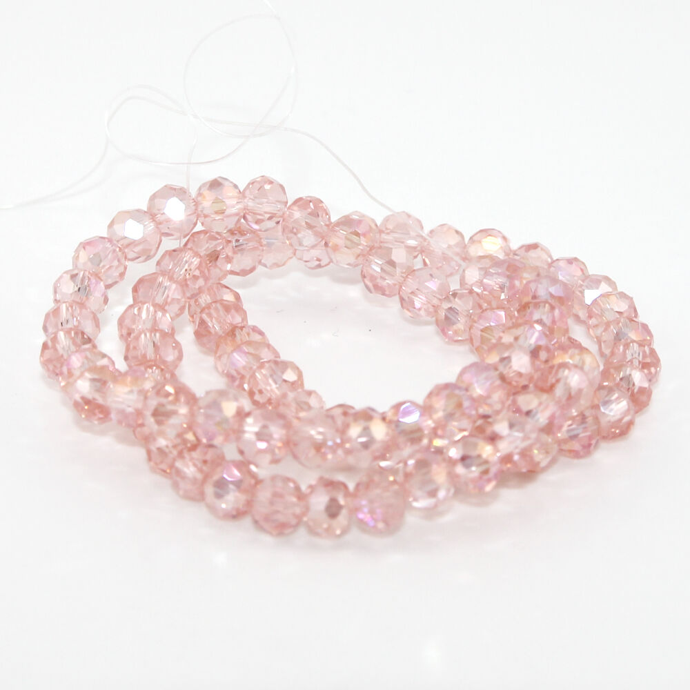 Rondelles are a versatile bead which can be used as a spacer in between larger beads or on their own to make an impact. These transparent Pink AB glass rondelles are 5mm x 6mm with a 1mm hole.