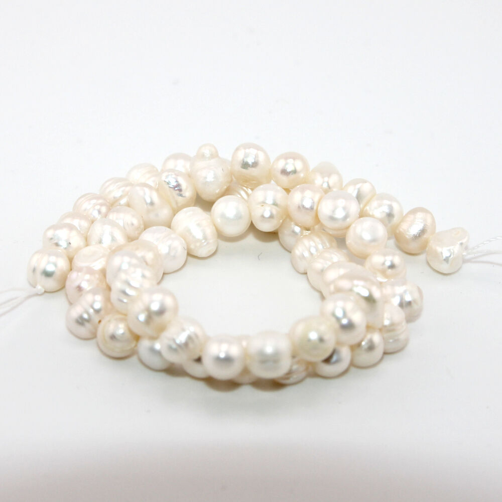 Freshwater pearls have a way of lifting our spirits and signify innocence and faith. The inner glow (orient) of pearls is thought to tap inner wisdom and nurture love. Pearls are biological gems that rise within clams and other mollusks. Freshwater pearls are formed when a foreign object acts as an irritant inside the shell. 6mm - 7mm White Irregular Freshwater Pearl - 35cm Strand