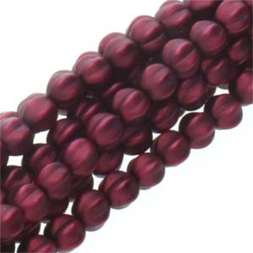 In StockSize: 6mm Hole: 0.8mm Colour: 790524562497 - Matte Burgundy Add some texture to your designs with these fun Czech Pressed Glass Melon Beads finished in the same way as pressed glass pearls. Like the pearls, these melon beads are created using the same techniques for pressed and fire polished beads, but have a different finishing technique giving them their pearl luster.