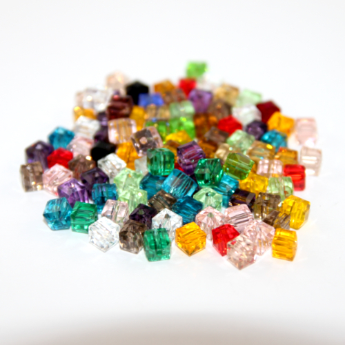 6mm Mixed Colour Crystal Cube - 20 Piece Bag A classic, straight geometric shape merges with an intricate cut in this bead to produce a component that is perfect for masculine looks and designs with corners, but also work very well when combined with more playful products. This traditional and versatile bead is a must-have in every collection, offering a broad range of design possibilities for a variety of products, including jewelry sets, accessory embellishments, and DIY designs.