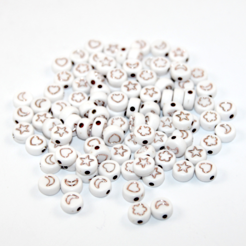 White acrylic flat round beads measuring 7mm x 3.5mm with a 1mm hole with a rose gold symbol. Sold in a mixed 200 piece bag.