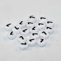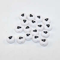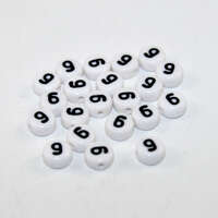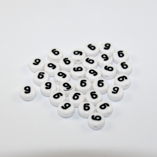 White acrylic flat round beads measuring 7mm x 4mm with a .21mm hole with a black number 6.