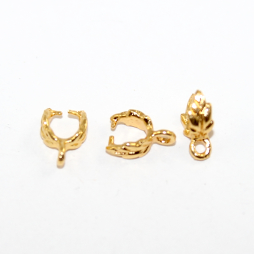 A leaf shaped pinch bail, use with pendants to create simple necklaces or earrings. These copper bails are Gold plated and measure 7mm x 10mm x 4mm with a 1.5mm hole.