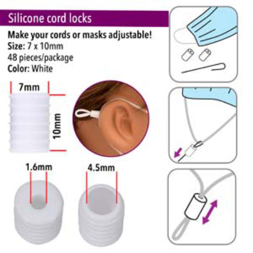 Sold Out - Backorder AvailableSilicone cord locks feature two different size holes to enable the folded cord to be passed through and held firmly to create adjustable straps. Sold in a 6 pair bag (12 pieces).