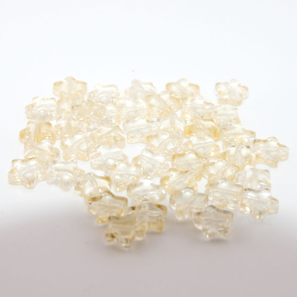 These 8mm stars are made from Czech-pressed glass, they are drilled vertically with a 0.7mm hole and are sold in packs of 20 8mm Matte Crystal with Gold Czech Glass Stars - 20 Pieces