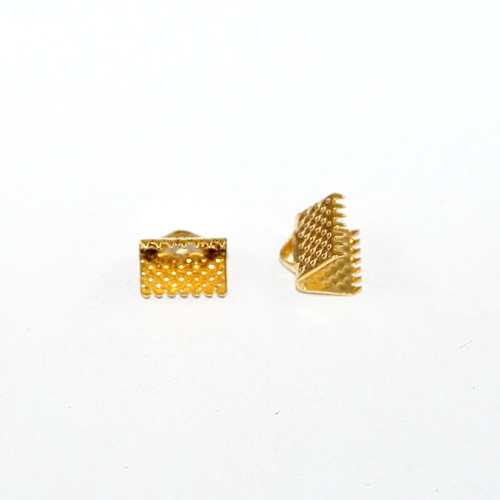 Ribbon crimps or choker clasps are used when working with woven fabrics or leather. They can also be used with handsewn pieces. This crimp is 8mm wide and is made from Zinc Alloy and has been plated in Bright Gold.