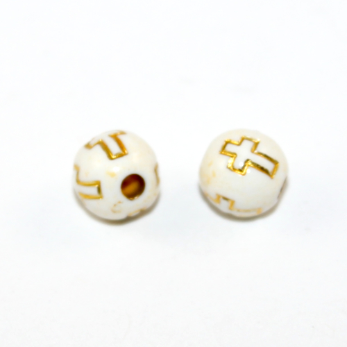 A simple vintage white 8mm acrylic bead with a etched gold lined cross detail. Ideal to use in a bracelet or a rosary.