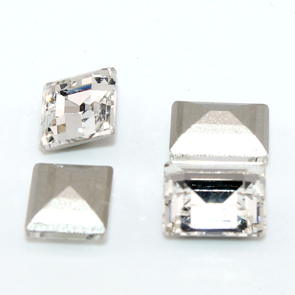 The rectangular Step Cut Stone features numerous parallel facets that become steeper towards the girdle, similar to an "emerald-cut diamond." Paired with its elevated top and special faceting, the element exudes an elegant and timeless appeal in fashion, accessories, and jewelry. This stone is perfect to use in hand sewing / weaving designs, capturing in filagrees / wire wrapping, setting in crystal / metal / polymer clay. These stones are made from glass with a foil backing, we recommend that you seal the foil backing prior to use. 8mm x 10mm Crystal - 4527 Step Cut Stone - Pack of 2