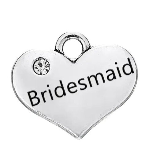 A simple stamped heart charm with a clear rhinestone - this heart has been stamped with Bridesmaid. This charm is made from Zinc Alloy & plated in Platinum - Bridesmaid Heart Charm with Clear Rhinestone - Platinum - 17mm x 14.5mm
