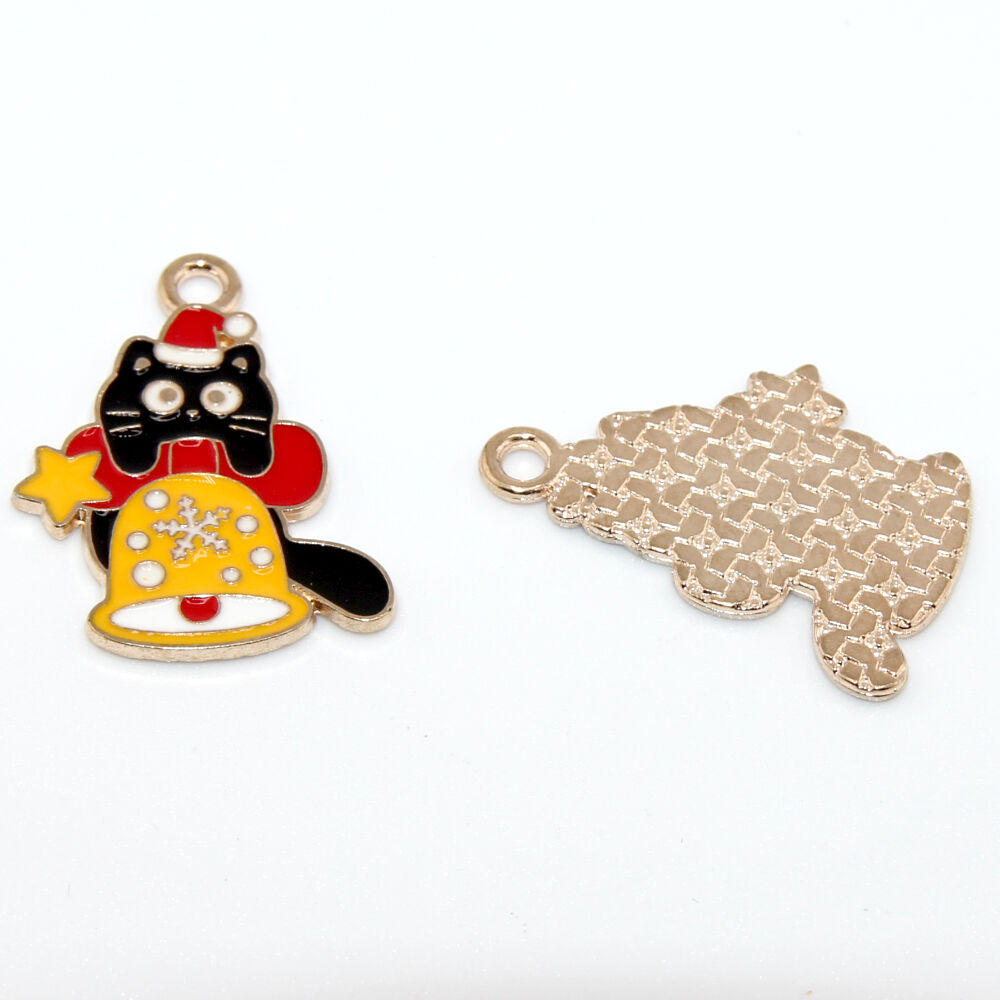 Cat on a Christmas Bell Enamel Charm - Pale Gold - 2 Pieces